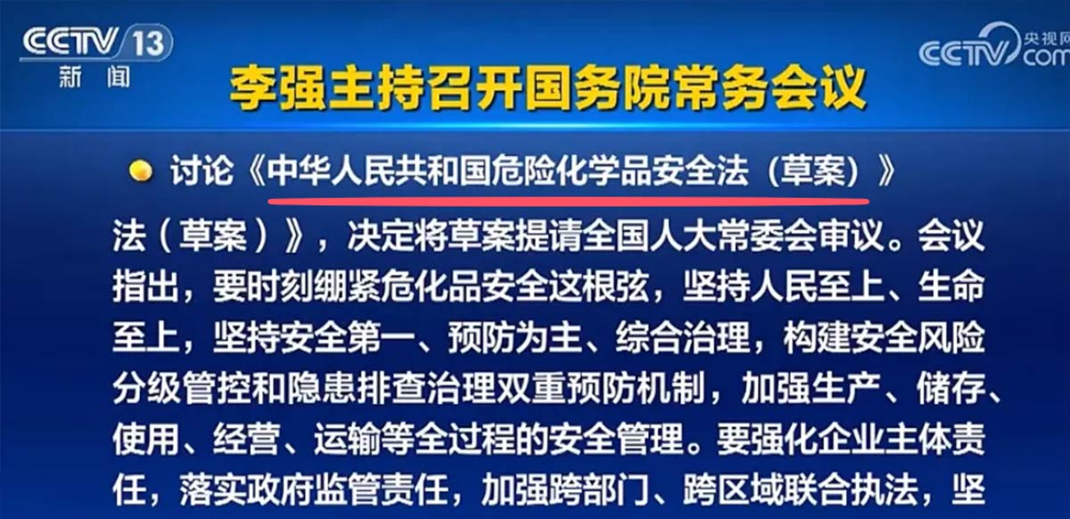 On December 21, the 13th meeting of the Standing Committee of the 14th National People's Congress reviewed the "Hazardous Chemicals Safety Law of the People's Republic of China (Draft)". The draft clarifies the overall requirements for the safety management of hazardous chemicals, emphasizes that the safety management of hazardous chemicals adheres to the principles of safety first, prevention first, and comprehensive management, and implements the principle that those who manage the industry must manage safety, those who manage the business must manage safety, and those who manage production and operations must manage safety.